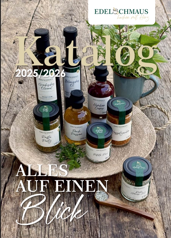 Im Edelschmaus Online Katalog bekommst Du einen umfassenden Überblick über alle Produkte, die Du bei mir, Deiner Edelschmaus-Beraterin probieren, testen und kaufen kannst. Von köstlichen Gewürzen bis hin zu hochwertigen Ölen, Essigzubereitungen und smarten Küchenhelfern – Edelschmaus bietet dir ein breites Sortiment für anspruchsvolle Genießer.